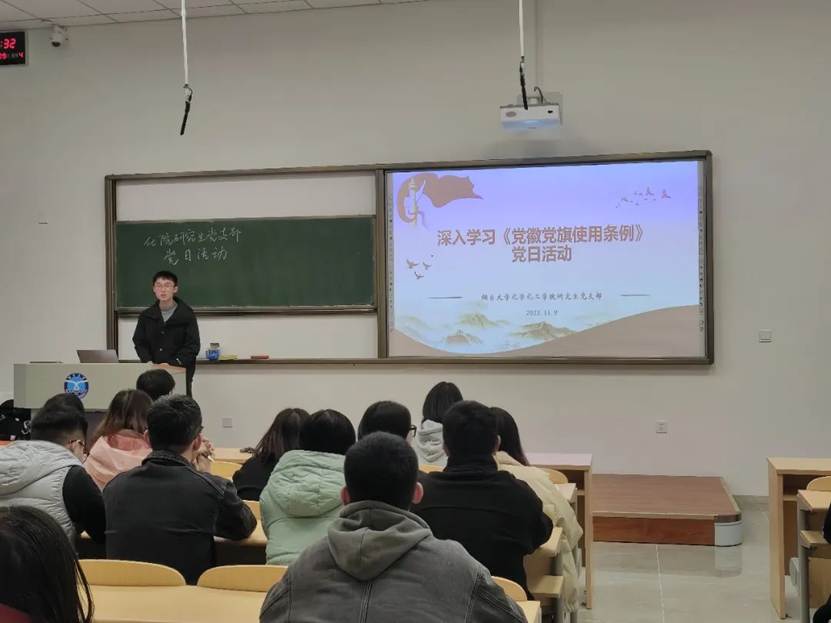研究生党支部党员纪律准则》,整合成政治纪律、组织纪律、廉洁纪律、群众纪律、工作纪律、生活纪律等“六大纪律”,划出了支部党员不可触碰的底线;同时对团员推优入党过程进行全程纪实,严控严管,杜绝违规违纪现象;每年新生入学后,都组织新生党员开展“学习《中国共产党党徽党旗条例》”主题党日,让新加入的党员同志充分了解党徽党旗使用条件,严肃支部纪律,保持党的先进性和纯洁性。