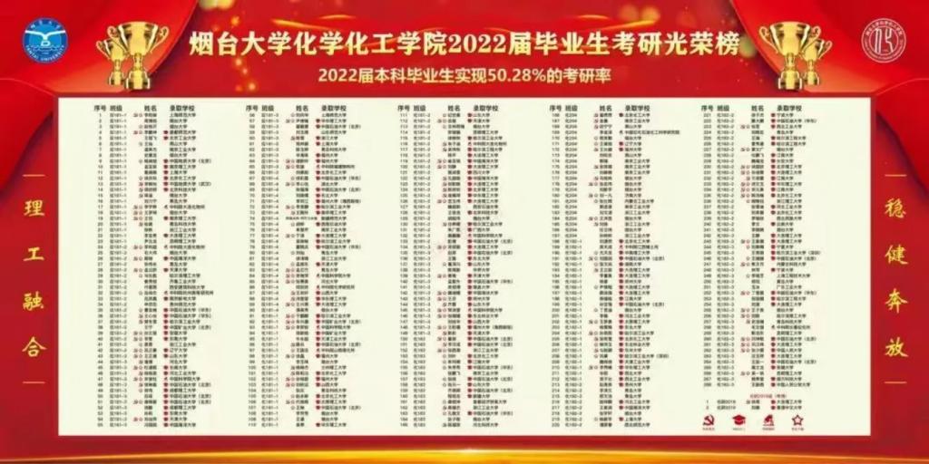 近五年,本科生考研率40%,就业率近100%。学生毕业后,主要在化工、医药、材料、能源和环保等企事业单位、科研院所、政府机关等从事设计、管理、研发和质量检验等工作,如:万华化学集团股份有限公司、中节能万润股份有限公司、京博控股股份有限公司、上海药明康德股份有限公司、海科集团、恒邦集团、富海集团等,大多毕业生已成长为公司的中高层管理与技术人员。