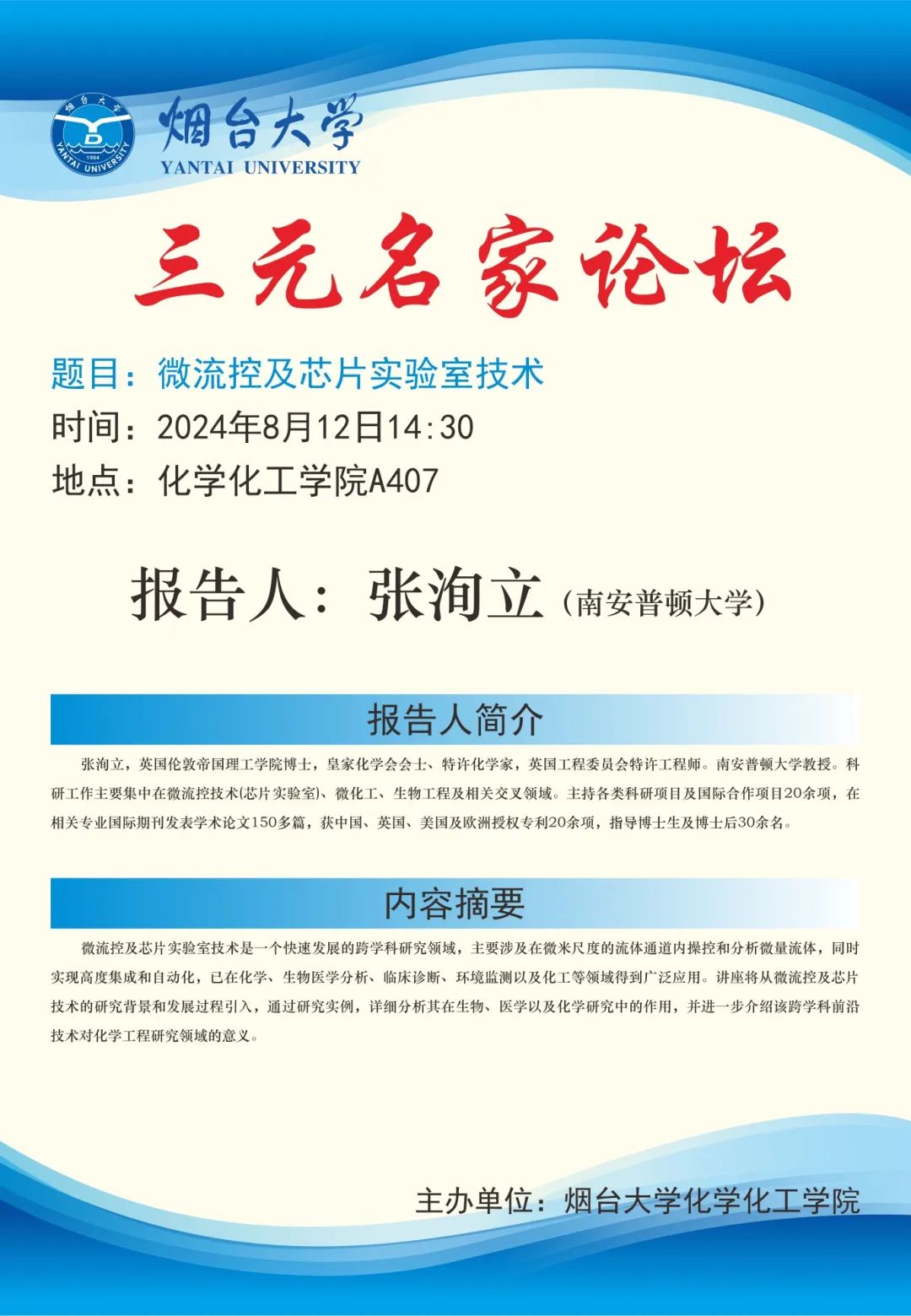 三元名家论坛(化院)丨《微流控及芯片实验室技术》,主讲:张洵立教授。