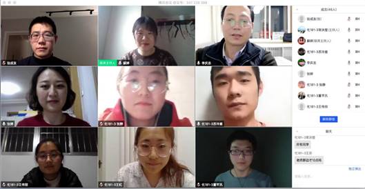 其中,化162-1班邀请到学院党委书记段志国老师、班级导师王慧敏老师、院团委书记张婷老师与会。班会上同学们积极发发言,结合疫情防控期间见闻的典型事例,阐述了各自的所思所感,并相互交流了居家隔离期间进行志愿服务、备战考研和积极就业的工作学习经历。在仔细聆听同学们的发言后,段志国书记和同学们交流到:这次疫情是一次生动的的生命教育课,对于生命有了更加深刻的认识,同学们要更加珍惜自己的生命与健康;这次疫情也是一次生动的科学教育课,应对疫情除了勇敢与激情,更应该用科学与专业的力量战胜疾病;这次疫情更是一次生动的制度自信教育案例,战胜疫情的过程中,充分体现了我国社会主义制度的独有优势。与会的其他几位老师也就同学们学业安排、复试准备及招聘就业等问题进行详解,与同学们积极互动,为同学们耐心答疑解惑,强调要找准人生方向,认真选择,早做准备。