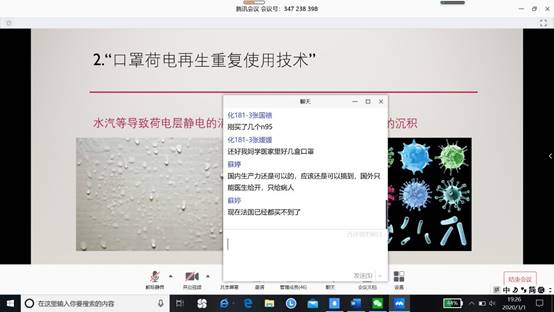 化181-3班围绕“战‘疫’中的化学”展开主题班会,学院副院长李庆忠老师、远在法国访学的导师苏婷老师、院团委书记张婷老师、18级辅导员张成友老师共同参会。班级同学代表围绕医疗产品展开讨论,将此次疫情与化学相结合,以提高大家运用知识防控疫情的能力。李院长就大家的讨论予以点评,并分享了疫情中化学科研攻关的新进展,普及化学防治方法。苏婷老师讲述此时在法国访学的见闻,引导学生加强自我教育和自我管理,上好“开学第一课”。最后,张婷老师讲解科创相关赛事情况,鼓励大家在扎实学科知识的基础上走出校园,开拓视野,科学高效备赛。