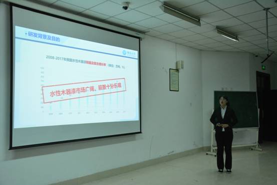 其中“助剂小分队”以绿色环保为出发点介绍了他们的项目“环境友好型高效抑制单宁扩散水性木器漆助剂”,他们通过创新,有效减少了制造能源消耗,减少制造费用。目前该项目已入围国奖且已与多家企业达成合作,其产品已处于中试阶段。
