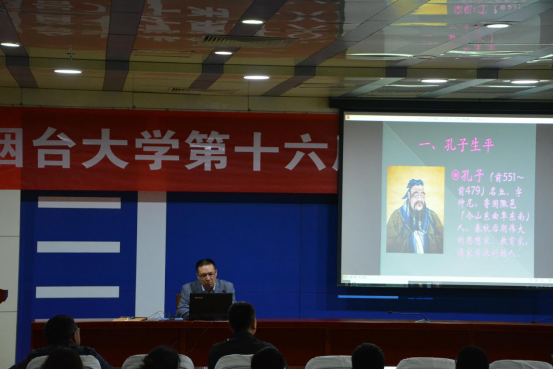 第十六届读书节系列活动之经典赏析讲座在逸夫报告厅顺利开展。本次活动邀请了人文学院院长、中国社会科学院高级访问学者、山东省美育专家资源库专家董晔老师主讲,董老师为师生们带来了题为“《论语》中的人生哲学”的精彩讲座。