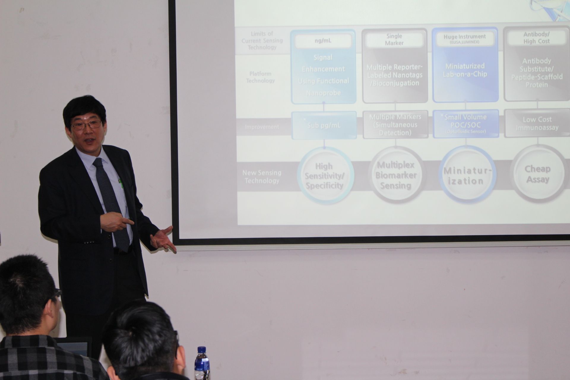 来自韩国汉阳大学的朱宰范教授为化院师生做了题为《Application of Optical Nanosensor for Clinical Diagnostics》的学术报告,报告内容形象生动,主讲人结合课题组最新的研究成果以及相关研究领域发展前沿与大家进行了交流,朱宰范教授给大家带来的不仅是国际前沿的学术知识,更让我们对如何更好地投身于科学研究中进而更快地解决科学问题有了更加清晰的认识。精彩的报告内容引起了听众极大的兴趣。报告结束后朱宰范教授还与听众进行了互动交流。