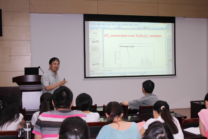 老师的题目是“全氟烃分解反应催化剂的研究—以CF4为例”,大家分享交流了利用催化水解法分解具有极高的温室效应潜值的全氟烃气体(如CF4)工业废气的研究中高活性、长寿命Al2O3基催化剂的研究过程及科研成果。