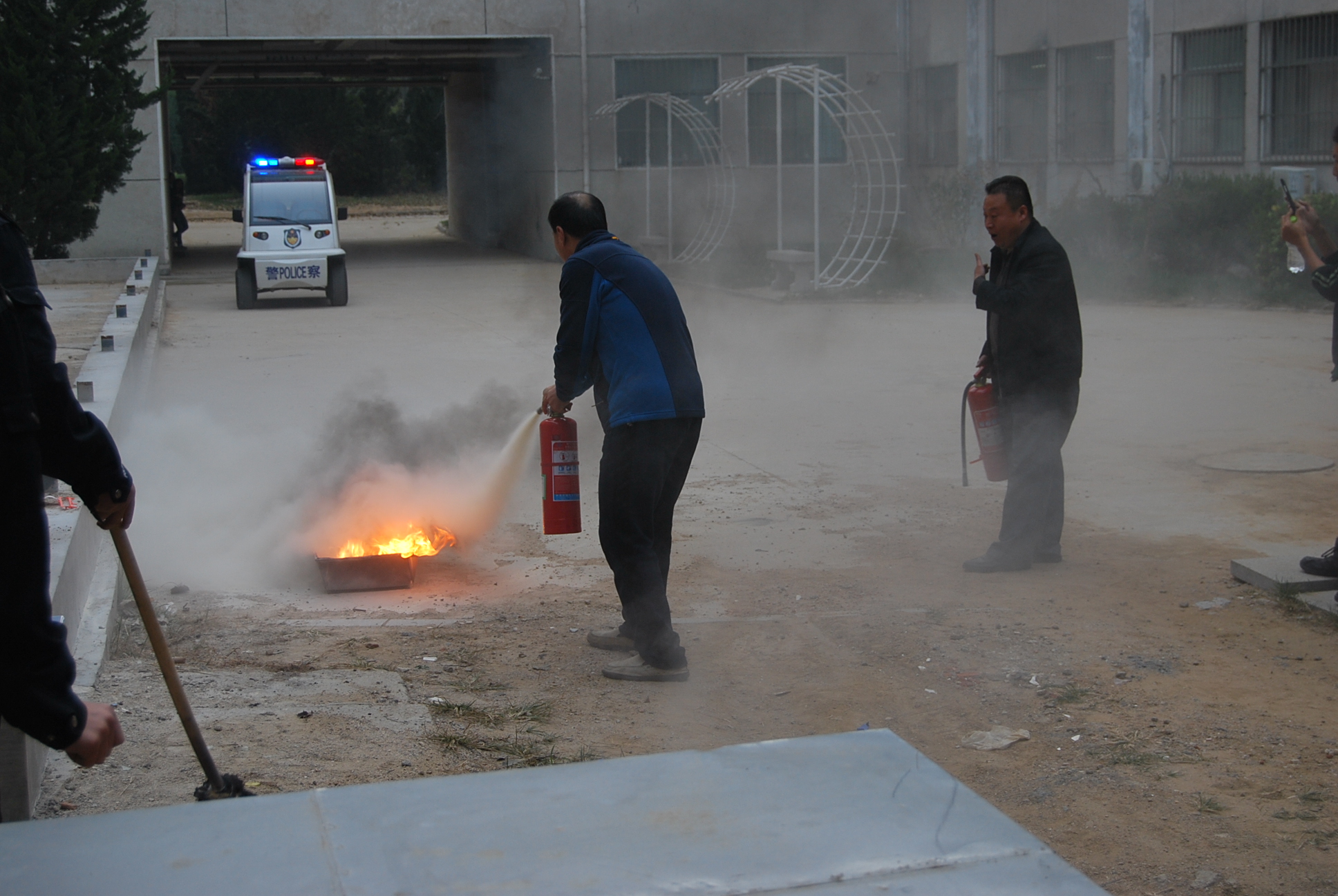 时先在化学馆外空地进行灭火演练,