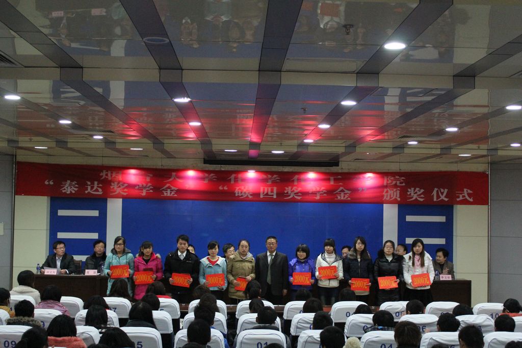 关于颁发2011-2012年度“泰达”奖学金的决定》。烟台泰达集团董事长宋华西先生向获得“泰达”奖学金的获奖同学颁奖并合影留念,与会领导向获得“碳四”奖学金获奖同学颁发了获奖证书,孙春阳同学和贾兵同学分别代表获奖学生发言。烟台泰达集团董事长宋华西先生以“不怕困难、不怕挫折、不怕出头、不怕失败、不怕吃苦、不怕低头“的“六个不怕”精神激励广大同学,要勇于面对困难,发奋图强,争做国家栋梁之才。随后,副校长邓昌亮发表讲话,他首先感谢泰达集团和碳四分离项目课题组的慷慨善举,在我校设立奖学金,并对偷情视频