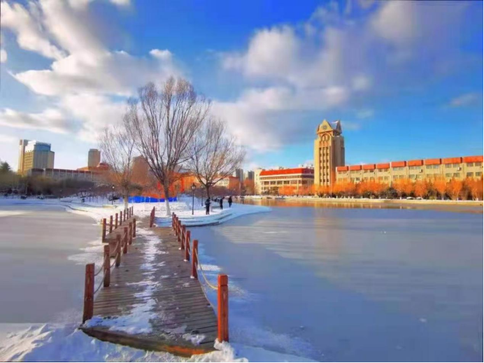 冬天到烟台来看雪,感受与北方有很大的区别。烟台的冬天,最冷的温度是零下12度(我经历的),也仅仅几天的时间,大部分是零度左右。我最喜欢走在纷纷扬扬的大雪中,空气清新湿润,微风拂面,一点也不冷,用手接住洁白绵软的雪花,瞬间融化在手心的感觉特别惬意,犹如春雨滋润禾苗,从心里感慨这个美丽星球梦幻般的景致,更从心底感谢大自然馈赠世间万物的阳光雨落,春风冬雪!烟台的雪存不住,照相通常选在上午十点前,阳光一出,屋檐,树枝,簇簇冬青,很快就有嘀嗒嘀嗒的雪水流下,被厚厚积雪覆盖的草坪树叶也一点一点露出枝芽,好像慢镜头春天万物复苏,小草树芽润无声的伸展腰肢。最有意思的是人行道,积雪消融很快,很难形成北方厚厚的光滑的冰面,路两边很快形成两股很大的水流,不消几天,路面又洁净如初。校园里几乎没有除雪的传统,学生老师也乐得在雪地里行色匆匆,学习工作之余欣赏壮观的雪景,也给平静的生活增添几许色彩。