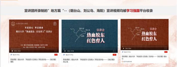后勤党委等。宣讲团还对宣讲视频进行录制、剪辑,经过学校和烟台市的大力推荐,被“学习强国”学习平台两次完整收录。