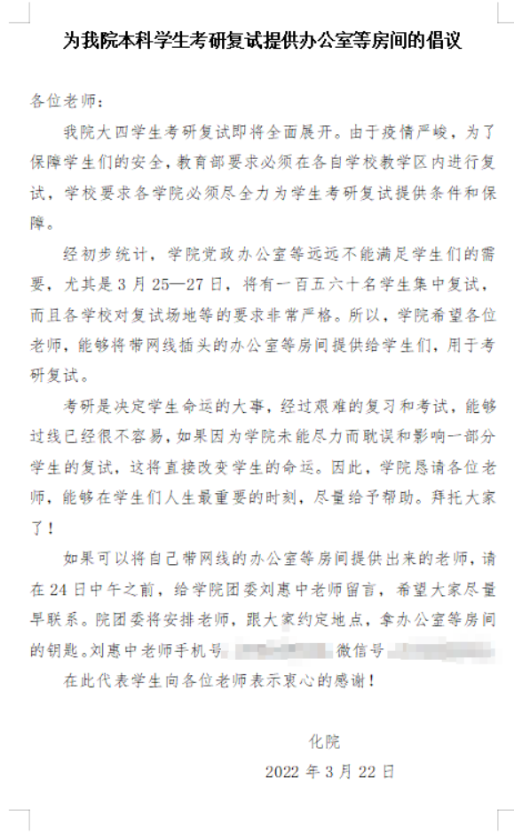 学院还向全体教职工发出了倡议,希望老师们将自己的办公室、实验室等提供给学生们。