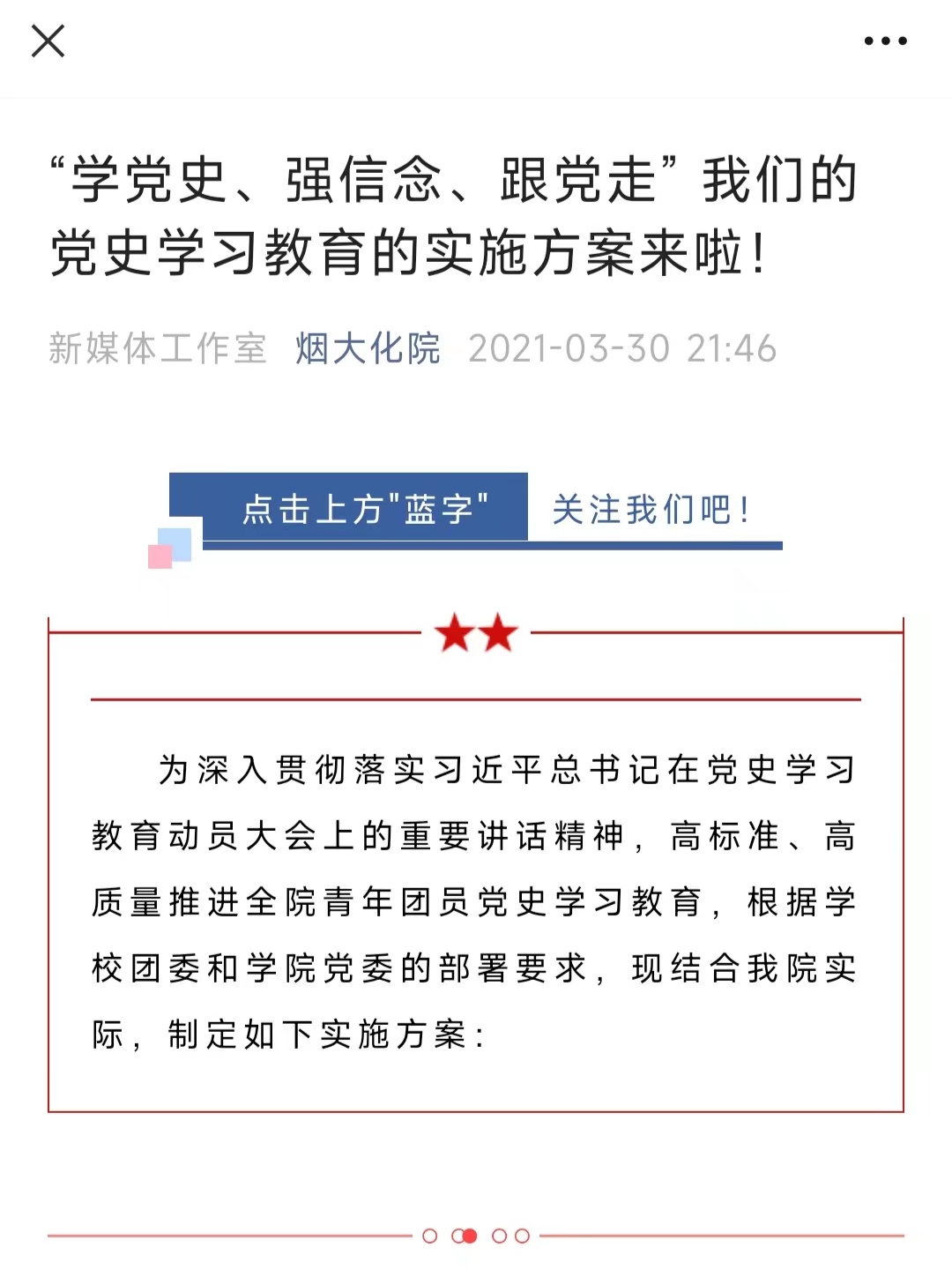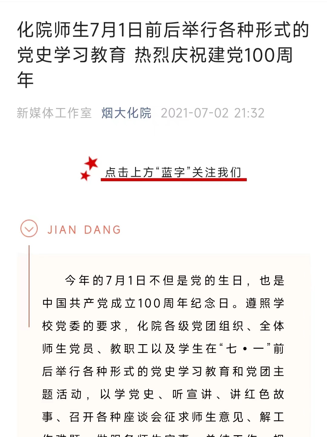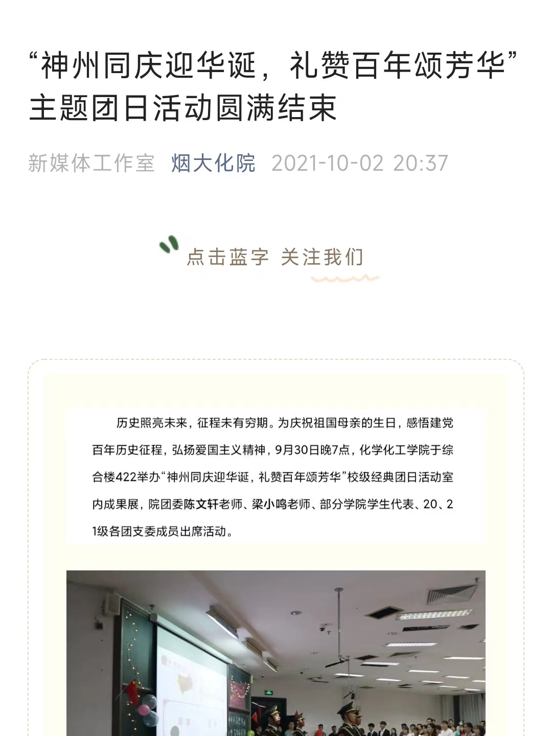 1.重视思想建设。围绕建党百年,化院组织青年大力开展“学党史、强信念、跟党走”党史学习教育,在全体团员中广泛开展“党史青年行”,围绕“七一”、国庆等重大时间节点,积极组织青年开展主题团课、团日。打造“瞭望角”专栏,关注时事。