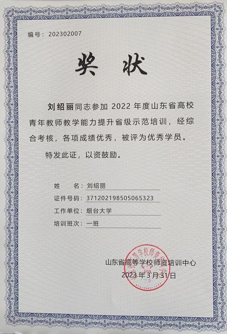 刘绍丽老师参加2023年省级青年教师教学能力提升省级示范培训并获得优秀学员奖。