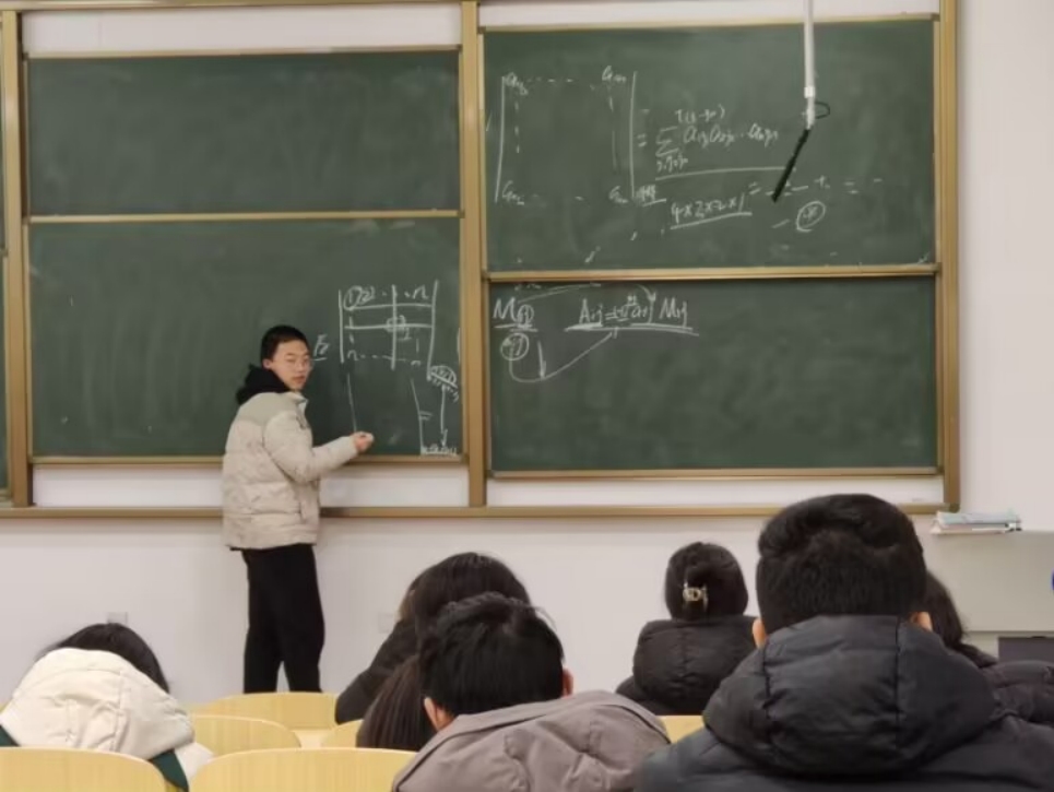 图为学生讲师应221-2班邵锦浩在为同学们补习线性代数。