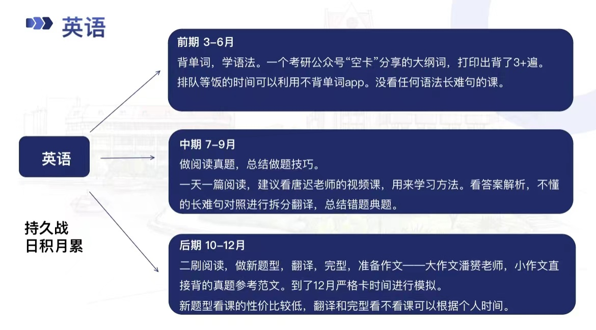 对于数学,他建议最好在暑假期间完成网课的学习,因为暑假是一个绝佳的学习时间,是实现弯道超车、超越自我的好机会。在温习一遍知识点后,应留出充足的时间来刷真题,通过实战来巩固和提升自己的数学能力。同时,他也强调了夯实基础的重要性。他告诫大家切忌眼高手低,否则只会捡了芝麻丢了西瓜。