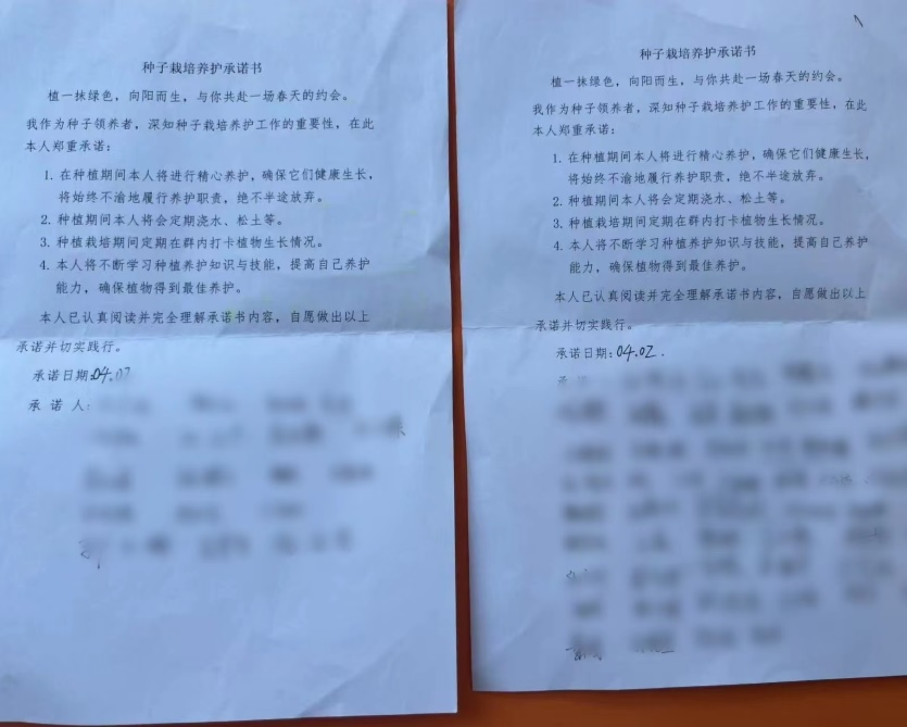 参与活动的同学,需要签署《种子栽培养护承诺书》。