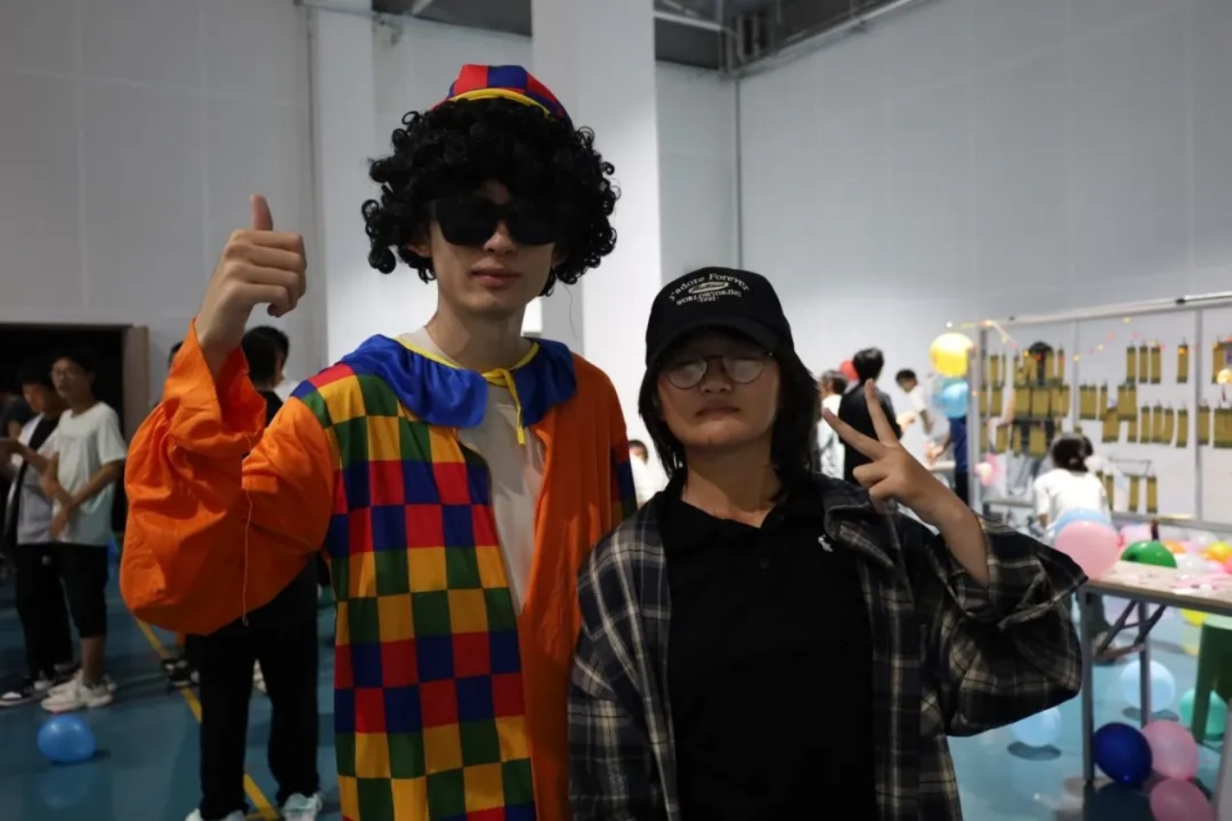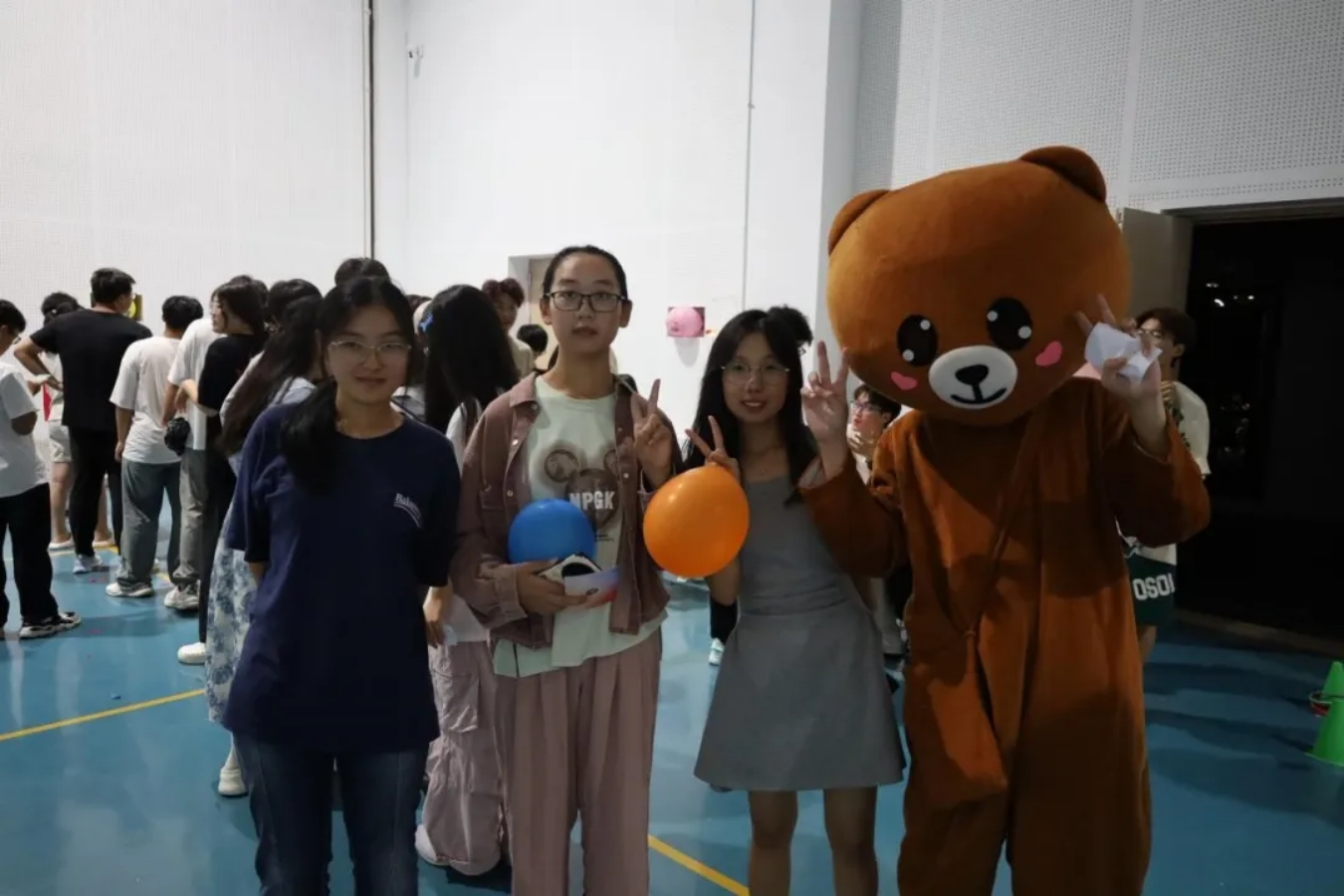 中秋游园会的赢取月饼券的同学们与“小丑”或“小熊”合影。