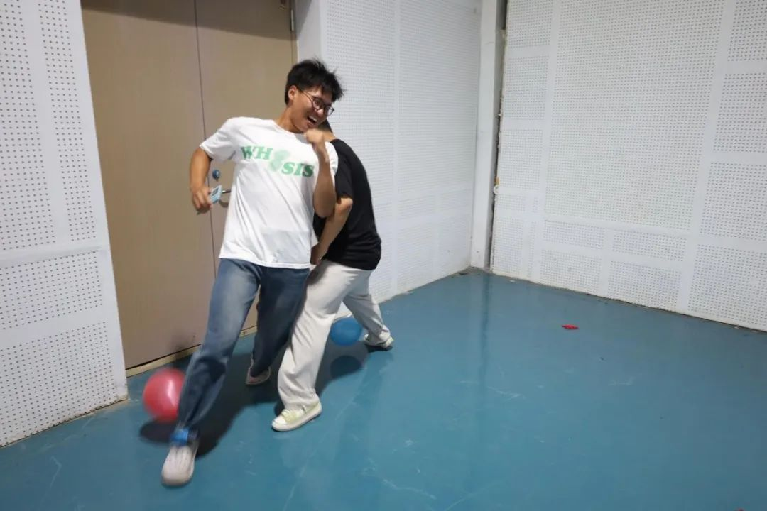 游戏规则:两人一组,一局两组,一人两个气球,将对方组气球全部踩爆,在最短时间内将气球全部踩爆的队伍获胜。