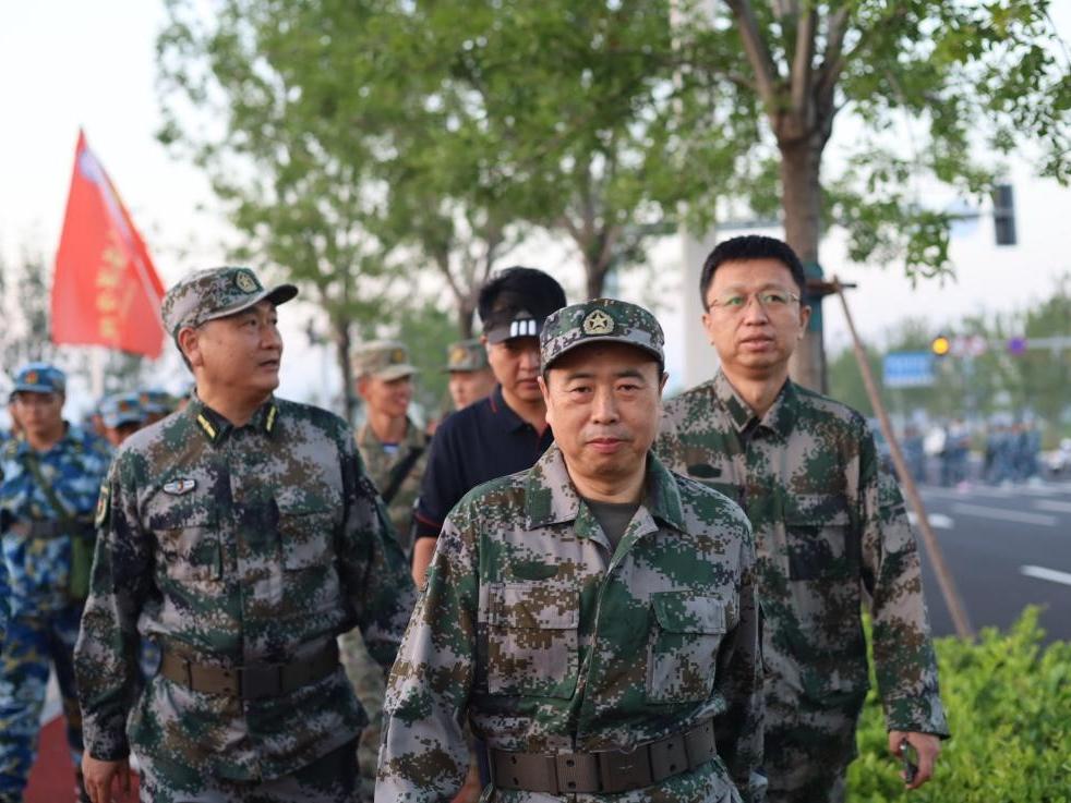 校长郝曙光、学工部部长冯建、化院党委副书记胡大鹏与新生们一起拉练。