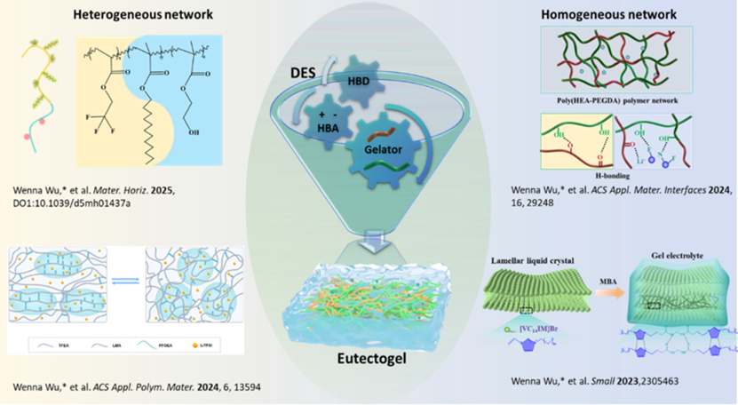 武文娜(通讯作者)与山东大学郝京诚(合作通讯作者)团队,在国家自然科学基金等项目资助下,围绕低共熔凝胶展开研究,制备出EC-LiTFSI等低共熔溶剂(DES),通过引入可聚合两亲分子、化学共价交联等方式,构建出具有纳米有序结构的液晶凝胶电解质等材料,解决了传统柔性可穿戴传感器在低温、潮湿及水下等极端条件下的性能问题,实现了高效触摸定位、水下通信与报警等功能,还研发出自阻尼离子凝胶;同时系统梳理基于胶体软物质的柔性器件设计策略与应用进展,相关成果发表于《Advances in Colloid and Interface Science》等期刊,为下一代储能传感技术提供思路。