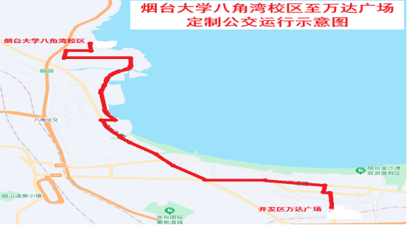八角湾校区始发,沿途停靠山东建筑大学(西门)、烟台智通人力、永旺梦乐城/开发区马家、市口腔医院开发区分院/海尔专卖店、新时代健康产业/万达广场5处站点,线路里程29公里,运行时间1小时,票价5元。