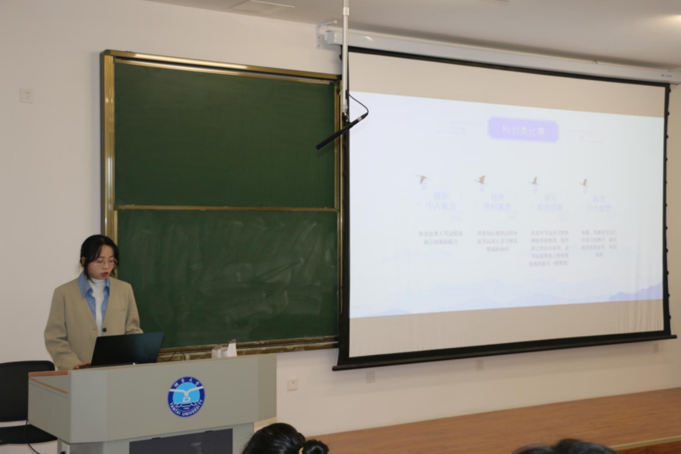 对科创赛事感兴趣同学展开科创宣讲,以学院科研育人体系为载体,指导学生参与实践和创新,以“挑战杯”、“互联网+”和省科创等代表性赛事为例向学生进行赛事介绍和参赛指导,提高学生创新能力和参赛技能。