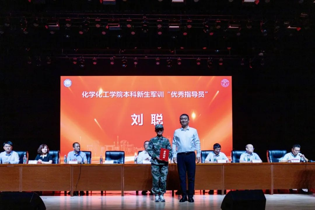 学院党委副书记胡大鹏老师为新生军训优秀指导员、本科新生辅导员刘聪老师颁奖。