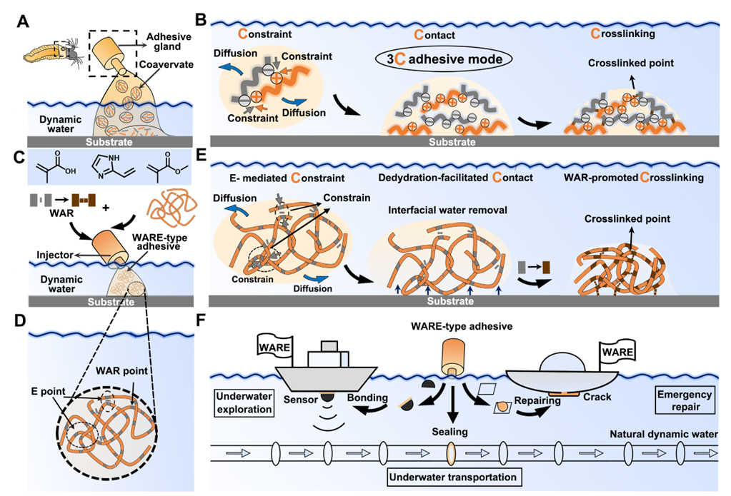 自然动态水环境中的高效粘合可有效促进人类水上活动。然而,粘合分子的损失,界面水的障碍以及动态水环境中的固化难题抑制了实际动态水环境中粘合的发展。目前自然动态水环境中适用的粘合剂十分有限。