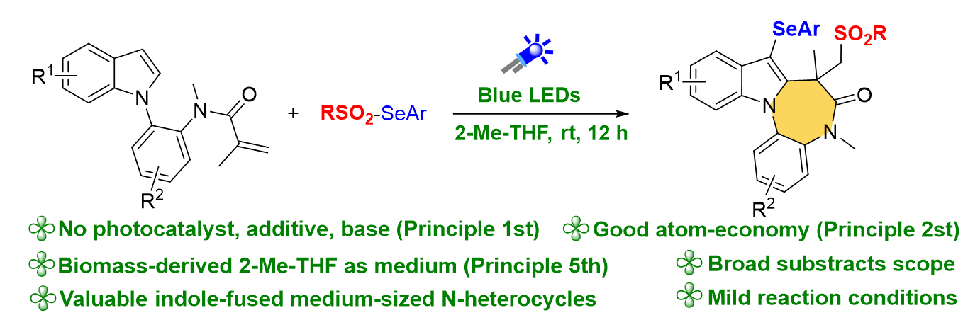 孙凯、徐鑫明、田苗等人报道了一种新型的可见光诱导磺酰化-环化-硒化反应。该反应通过可见光诱导(遵循绿色化学第六项"能量效率优化"原则)的均裂途径,同步产生亲电性磺酰基自由基与中性硒自由基,进而在无添加剂、无碱、无外源性光敏剂(遵循绿色化学第一项"污染预防"原则)的条件下,采用生物质溶剂2-Me-THF(符合第五项"安全溶剂"原则),实现了具有原子经济性的磺酰化-环化-硒化三级串联反应,为构建结构复杂的吲哚并氮杂中环化合物提供了普适性合成策略。