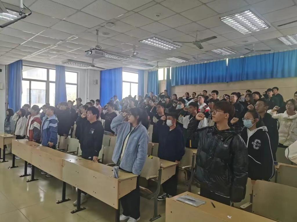 考试前,线下同学们有序进入考场,主动将手机和备考资料等整齐地放在规定位置,在讲台前抽取自己座位号码,接着坐到相应位置并在《诚信考试承诺书》上签字。线上同学则在志愿者的引导下进入腾讯会议室,采取双机位考试模式。随后,各班学习委员宣读了《诚信考试承诺书》,紧接着在领誓人的带领下,线上线下全体同学起立,举起右拳,庄严宣誓:“牢记师长嘱托,不负烟大厚望;认真规范答题,严守考场纪律;守住人生底线,公平参与竞争;珍惜人格名誉,做光荣化院人!”在响亮又庄严的宣誓声后,考试时间到,各考场负责人按时发放试卷后离开考场。