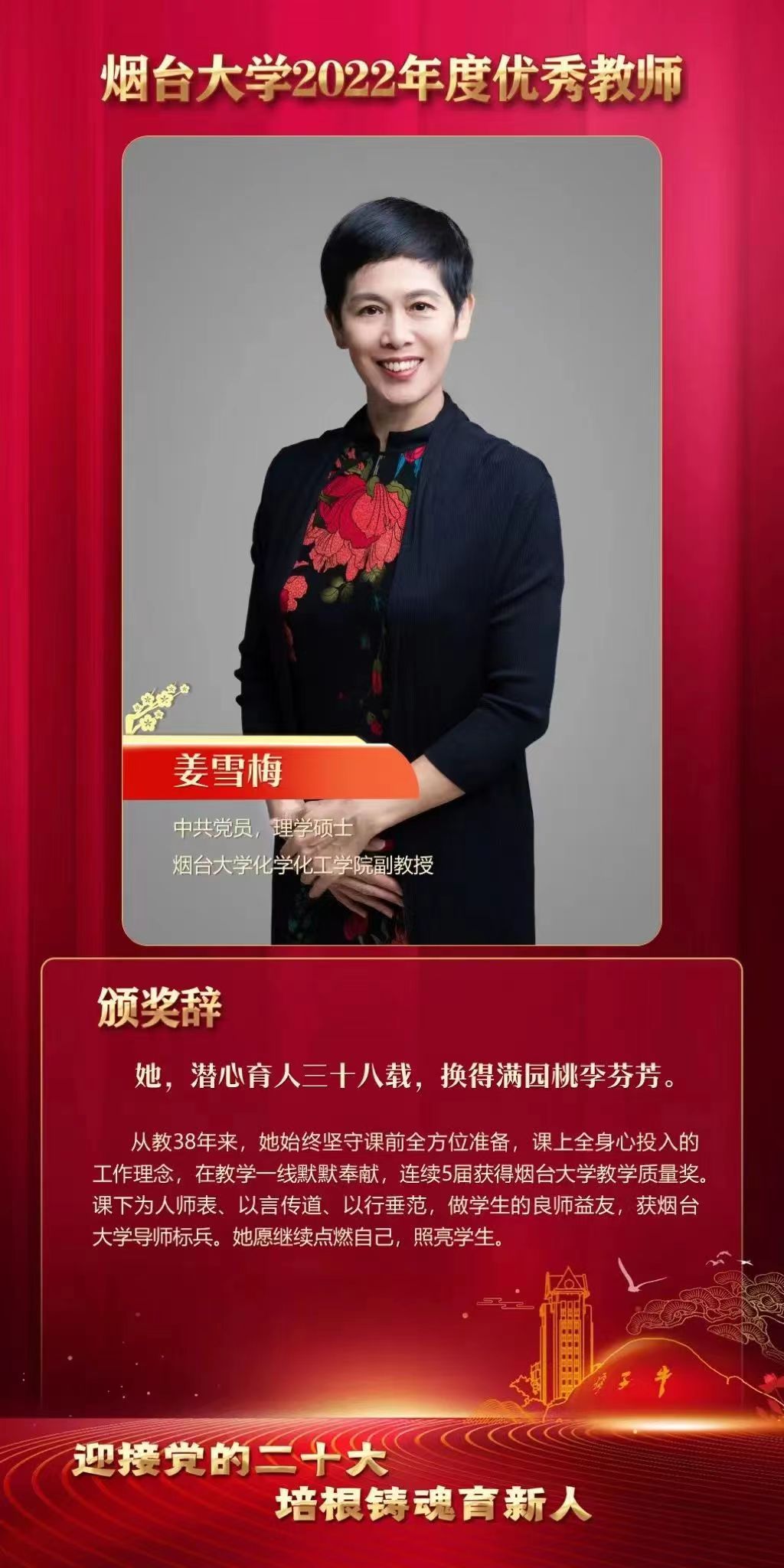 图为学校给予姜雪梅老师的颁奖辞