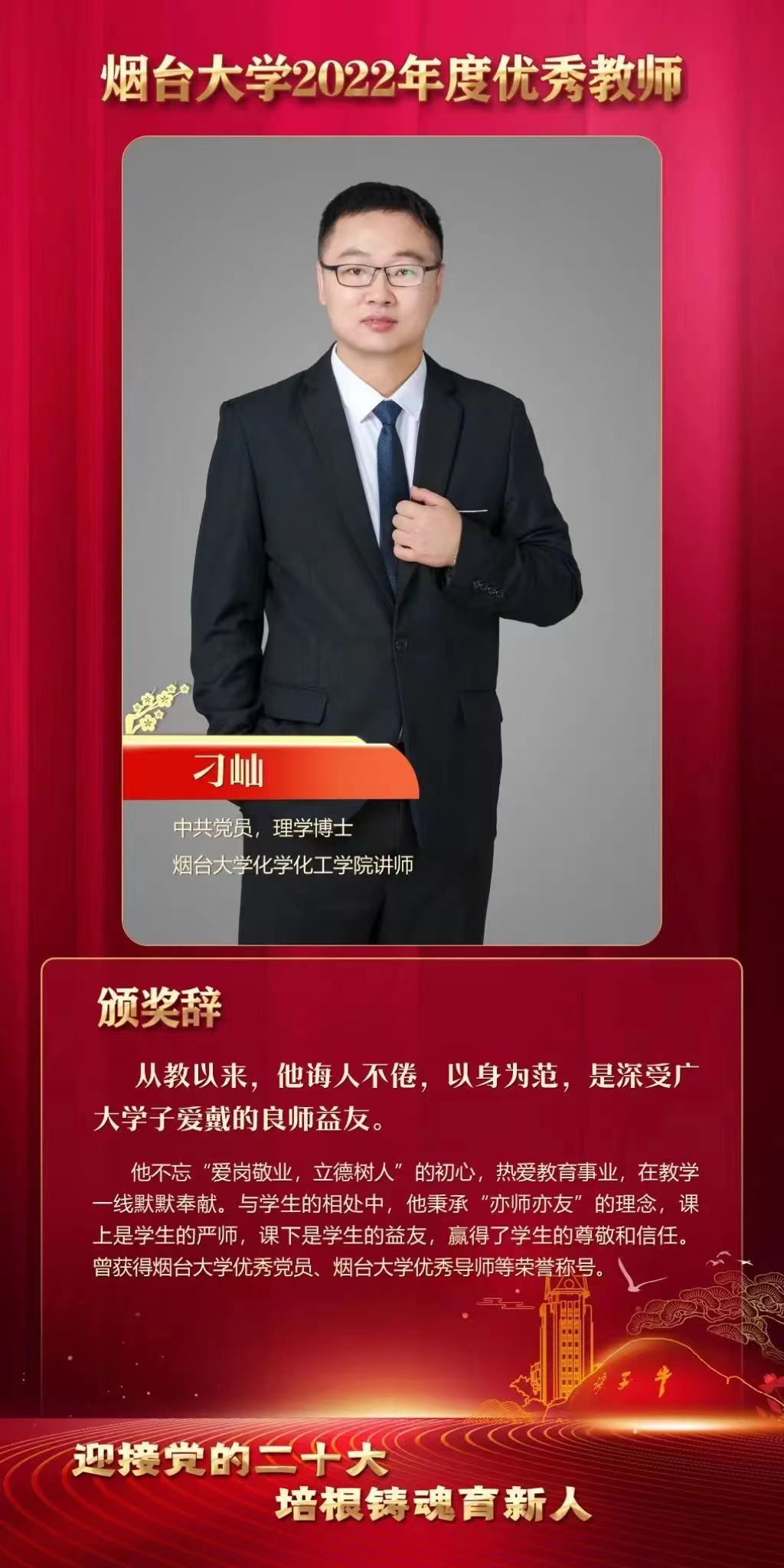 图为学校给予刁屾老师的颁奖辞