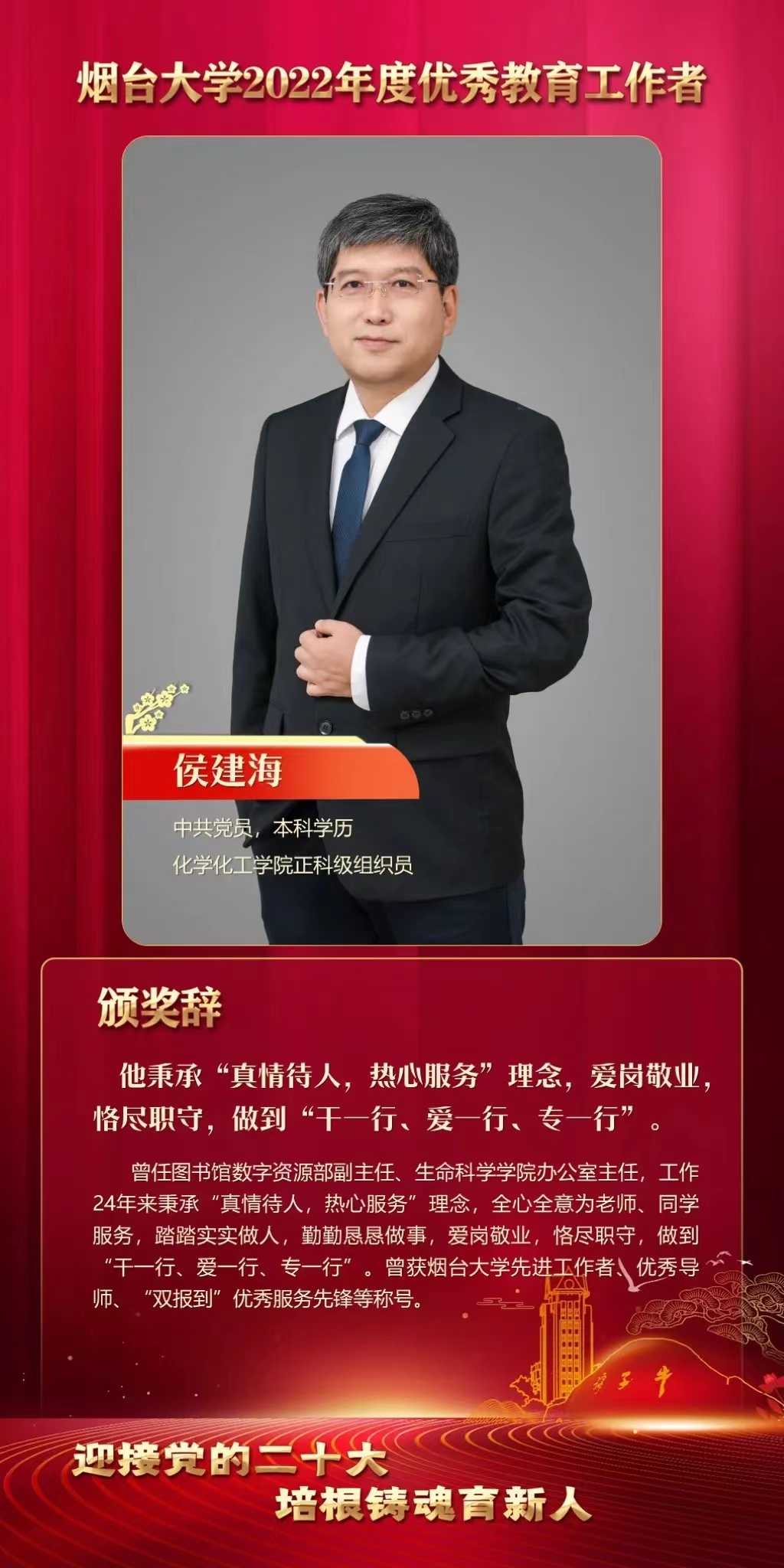 2022年度优秀教师荣誉称号,侯建海老师获评烟台大学2022年度优秀教育工作者荣誉称号。一起来认识一下他们吧!