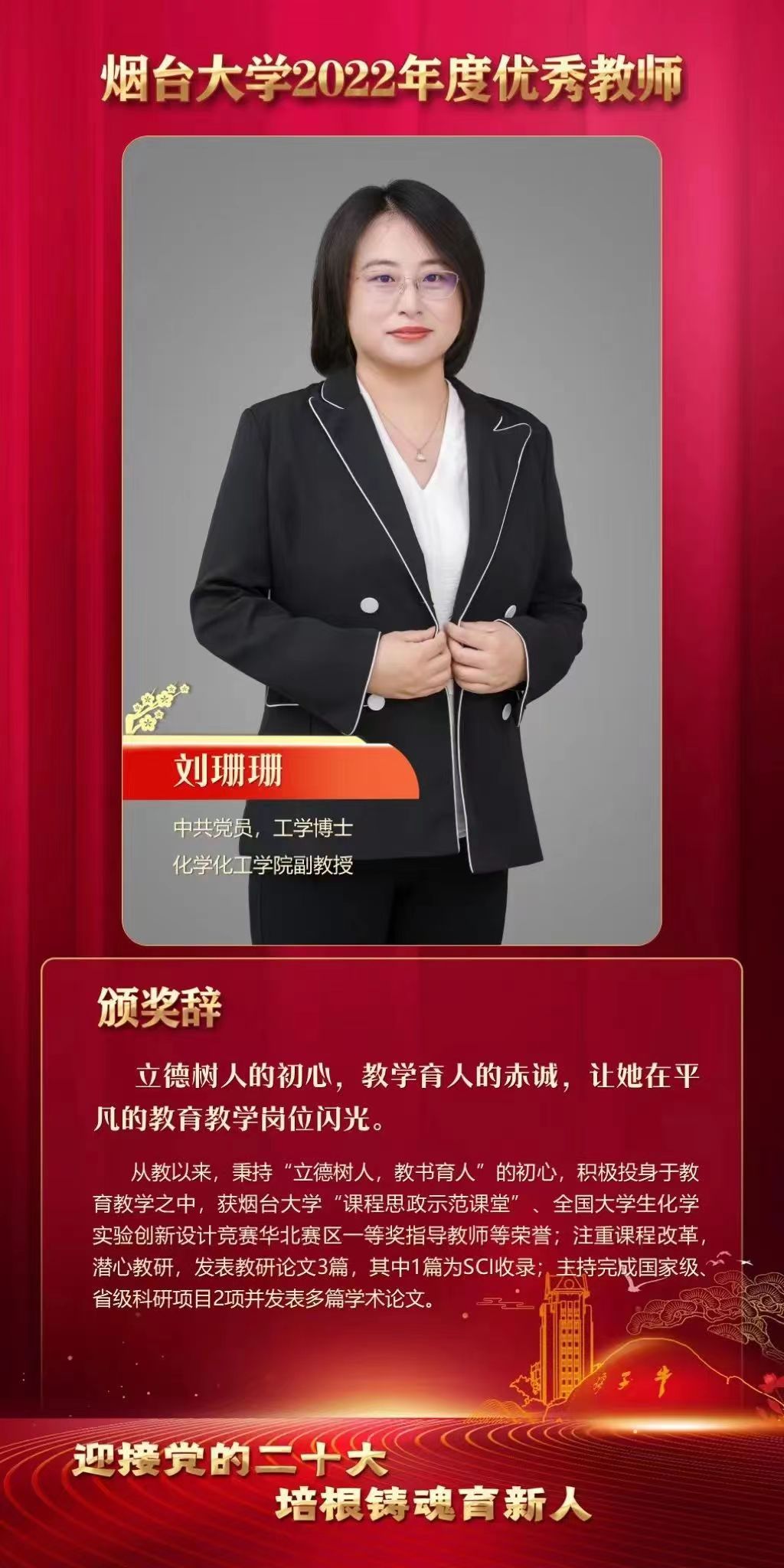图为学校给予刘珊珊老师的颁奖辞
