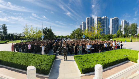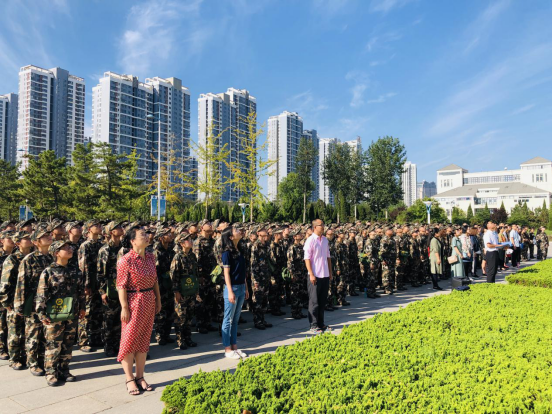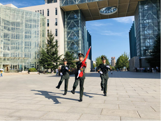 早上八点整,迎着初升的朝阳,全体新生着军装同学院老师一同井然有序的站立在升旗仪式场地。踏着铿锵的正步,国旗护卫队护送着国旗向旗台行去,雄壮有力的国歌,回荡在烈日晴空之下。在全体师生的注目中,五星红旗缓缓升起,迎风飘扬着的是不仅是化院为祖国70周年华诞的深情献礼,也是学院对19级新生寄托的厚望。