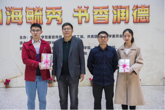 人文学院党总支书记刘知德老师向同学们捐赠了由人文学院兰翠教授为首的教师团队合著的《中国古代文学经典选读》三卷本和人文学院副院长张胜利老师的著作《现代视域下的中国古典文学研究》;马克思主义学院丁大尉教授向同学们捐赠了自己的著作《网络时代的科学交流体系研究》。