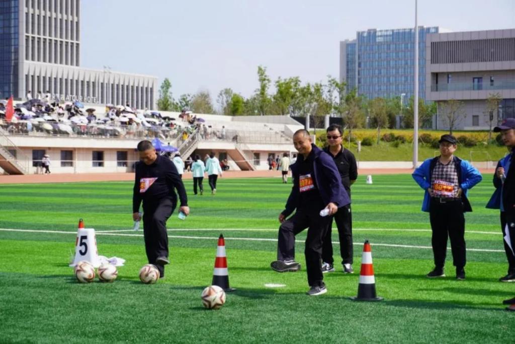 何涛老师正在进行“足球射门”趣味比赛。