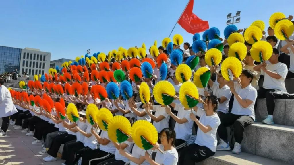 运动员们入场的同时,看台上翻花队的“化小水”们也在为运动员们加油助威。他们手里紧握着一柄圆扇,随着鼓声的节奏,扇子开始变幻颜色,如同盛开的花朵,摆出“爱专业”“爱化学”“2024”“NO.1”的字样,为大家献上一场视觉盛宴。
