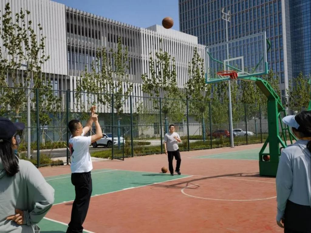 化院老师们在进行集体投篮趣味比赛。