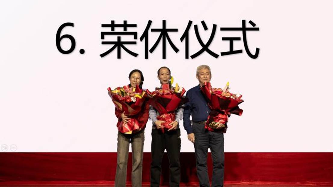 晚会上,学院为2024年退休的老师举办了荣休仪式。党委书记林立成代表学院向老教师们表达了崇高的敬意和美好的祝愿,希望老同志们能持续为学院的发展进步出谋划策,贡献力量。