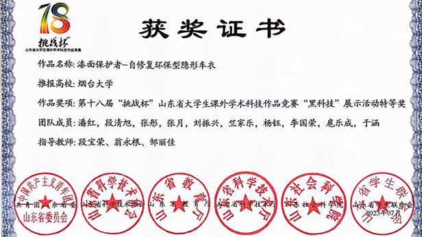 “优秀学生奖学金”、2022-2023学年社会类奖学金“正海创新英才奖学金”;第十八届“挑战杯”全国大学生课外学术科技作品竞赛中“黑科技”赛道获评“卫星”级作品(国家三等奖)、第十四届“挑战杯”山东省大学生创业计划竞赛省级金奖、“建行杯”山东省大学生创新大赛(2024)省级金奖;获共青团山东省2023年“百万大学生进社区”社会实践活动通报表扬,获评“省属高校青年学生先进个人”荣誉称号。