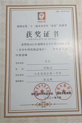 刘振兴获得淄博市第二十一届中小学“布谷”科技节二等奖。