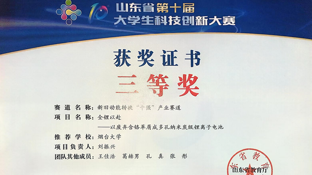 刘振兴参加第十四届建设银行“挑战杯”山东省大学生创业计划竞赛的团队合影及获奖证书。